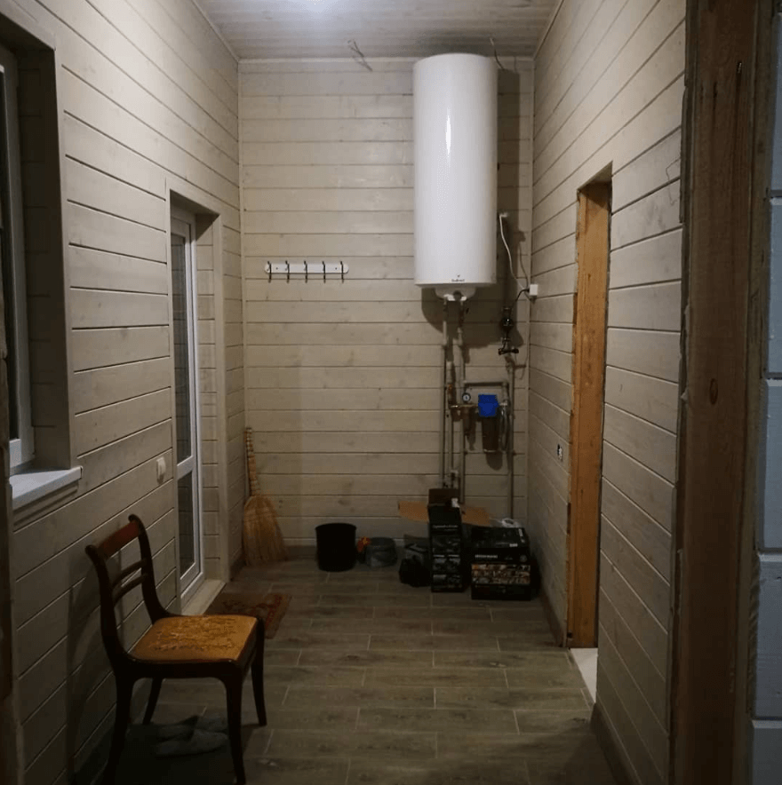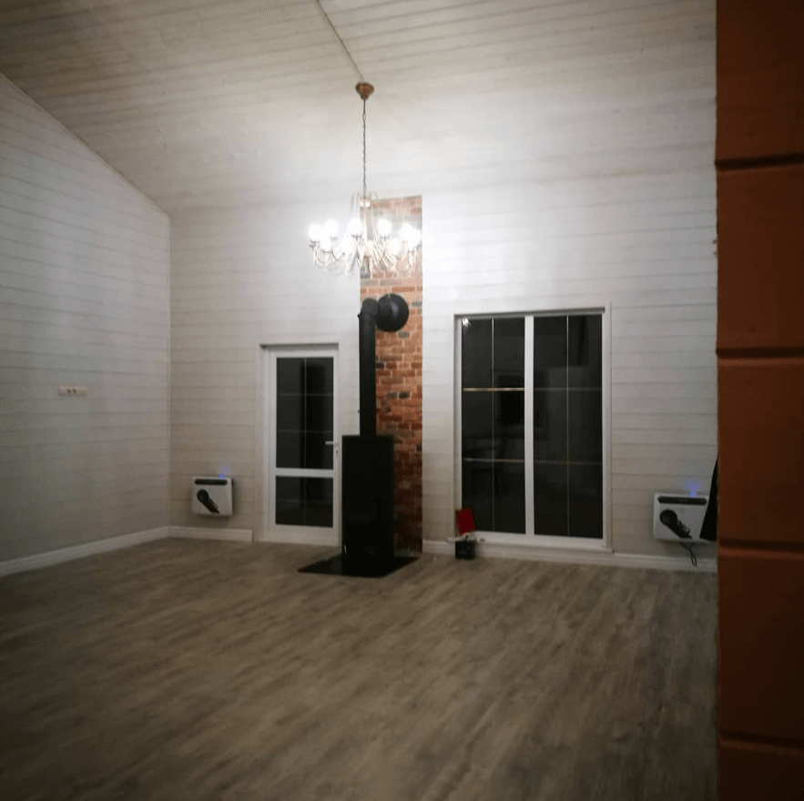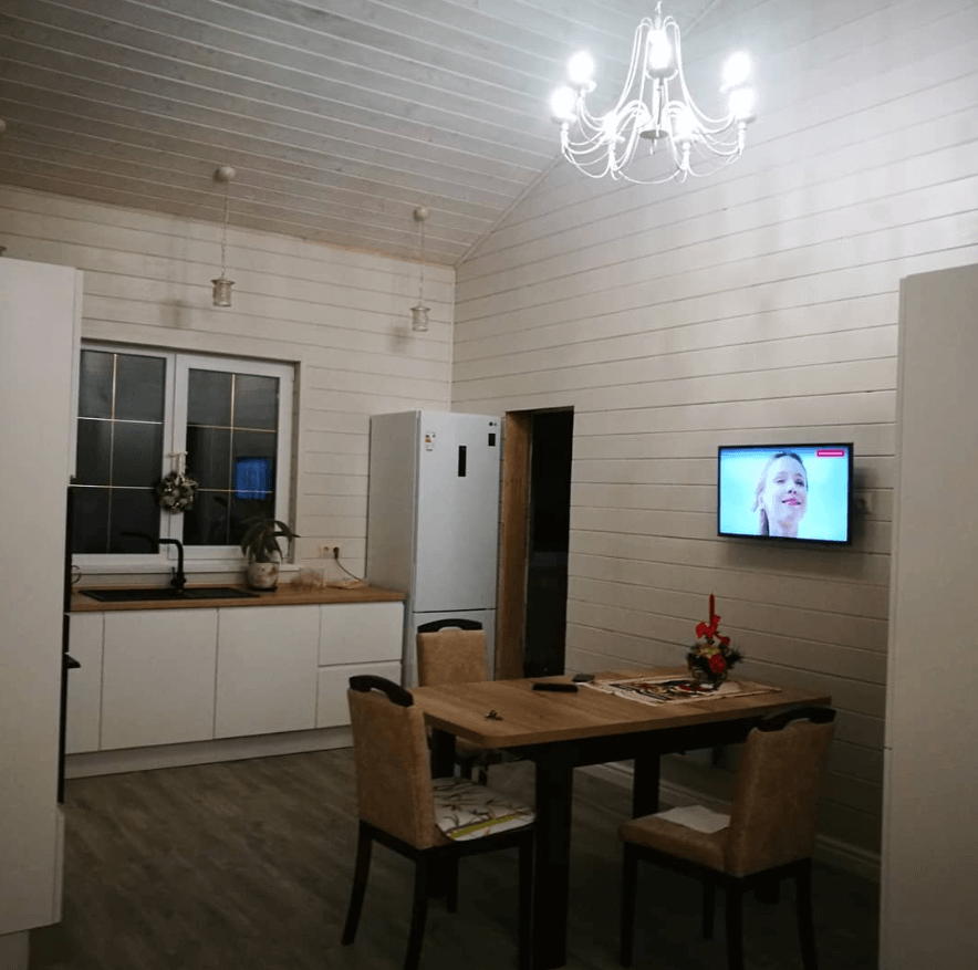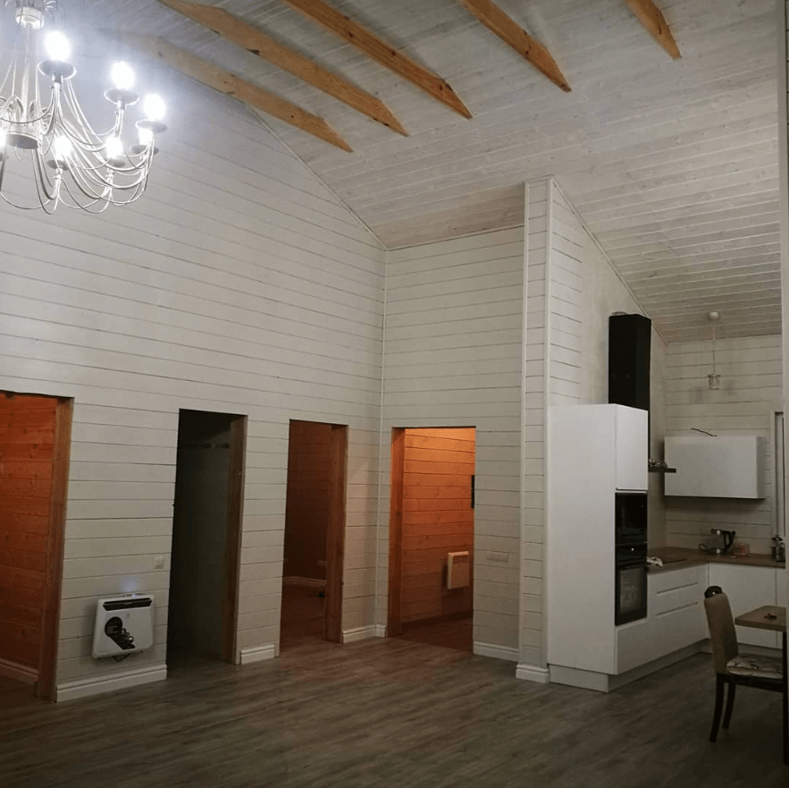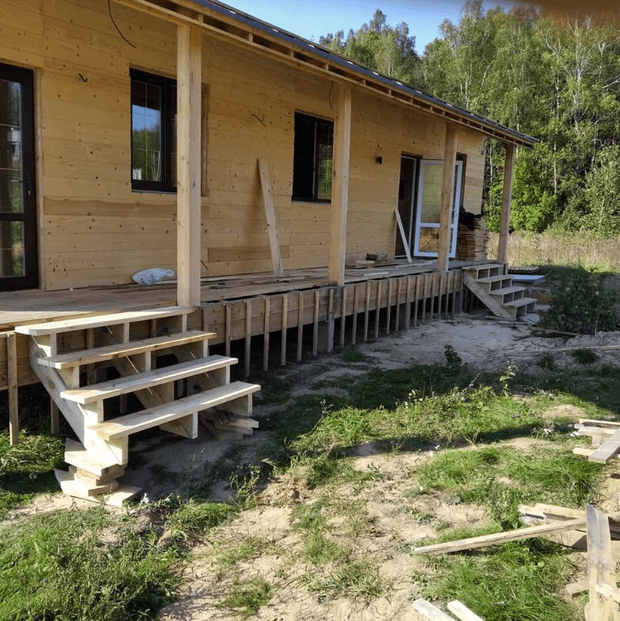 Каркасный дом. 139 м2, две террасы 60 м2. Тамбур, хозяйственное помещение, 2 санузла, 3 комнаты, кухня-гостиная. Стены обшиты имитация бруса(вагонка). Стены и потолки покрашены.